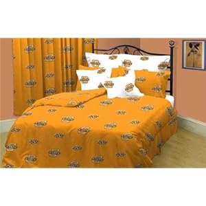 Support your team with Oklahoma State Cowboys Bed in a Bag. 6 Piece Set Includes: 1 Comforter, 1 Pillow Sham, 3 Piece Sheet Set (1 Flat Sheet, 1 Fitted Sheet, 1 Pillow Case), 1 bed Skirt. Fabric is 200 thread count 100% cotton sateen.