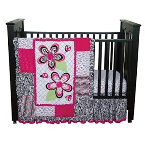 Zahara 3 Piece Crib Bedding Set by Trend Lab brilliantly mixes fashion-forward black and white with bright pops of paradise pink and electric lime. Luxurious paradise pink rosette velour is mixed with a trend-right zebra print, cute confetti dots and amped up black and white stripes with floral accents. Ladybugs and flowers bring whimsy to the nursery for your little diva. Quilt measures 35" x 45" and features embroidered and appliquéd flowers and ladybugs set against a black and white diamond print and surrounded by a large multi-patch frame. Paradise pink rosette velour is combined with a variety of cotton percale prints, including a black and white zebra print, a paradise pink and black confetti dot print on a white background and a black and white stripe print with paradise pink and electric lime floral accents. The quilt is backed with the adorable confetti dot and is finished off with a girly zebra print ruffled trim. Confetti dot print sheet in paradise pink and black on a white background features deluxe 10" deep pockets and fits a standard 52" x 28" crib mattress. Elastic around the entire opening ensures a more secure fit. Ruffled crib skirt with 15" drop features a fashionable zebra print and is trimmed with paradise pink rosette velour. Matching Zahara Crib Bumpers sold separately. Complete your child's room with coordinating accessories from the Zahara collection by Trend Lab.